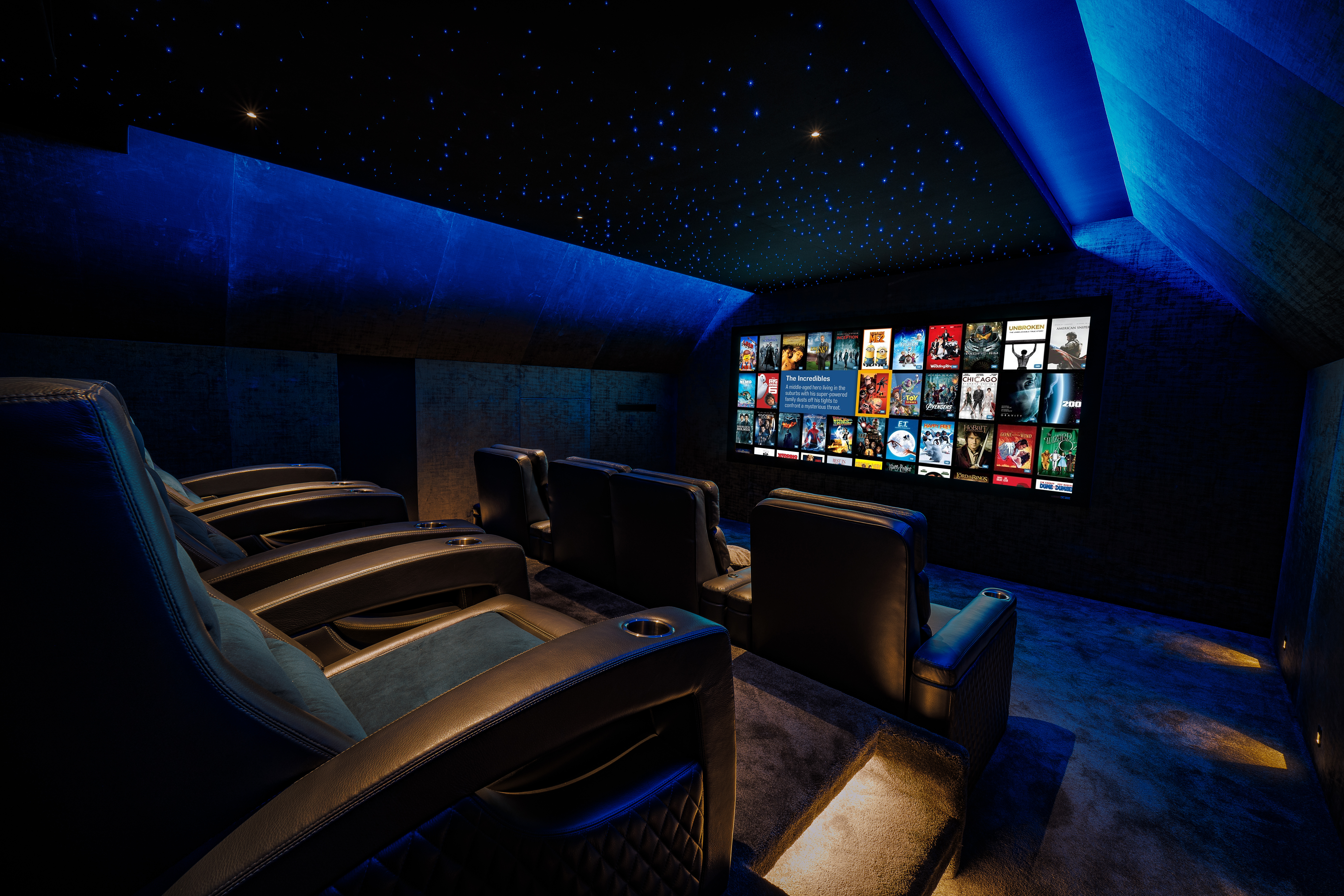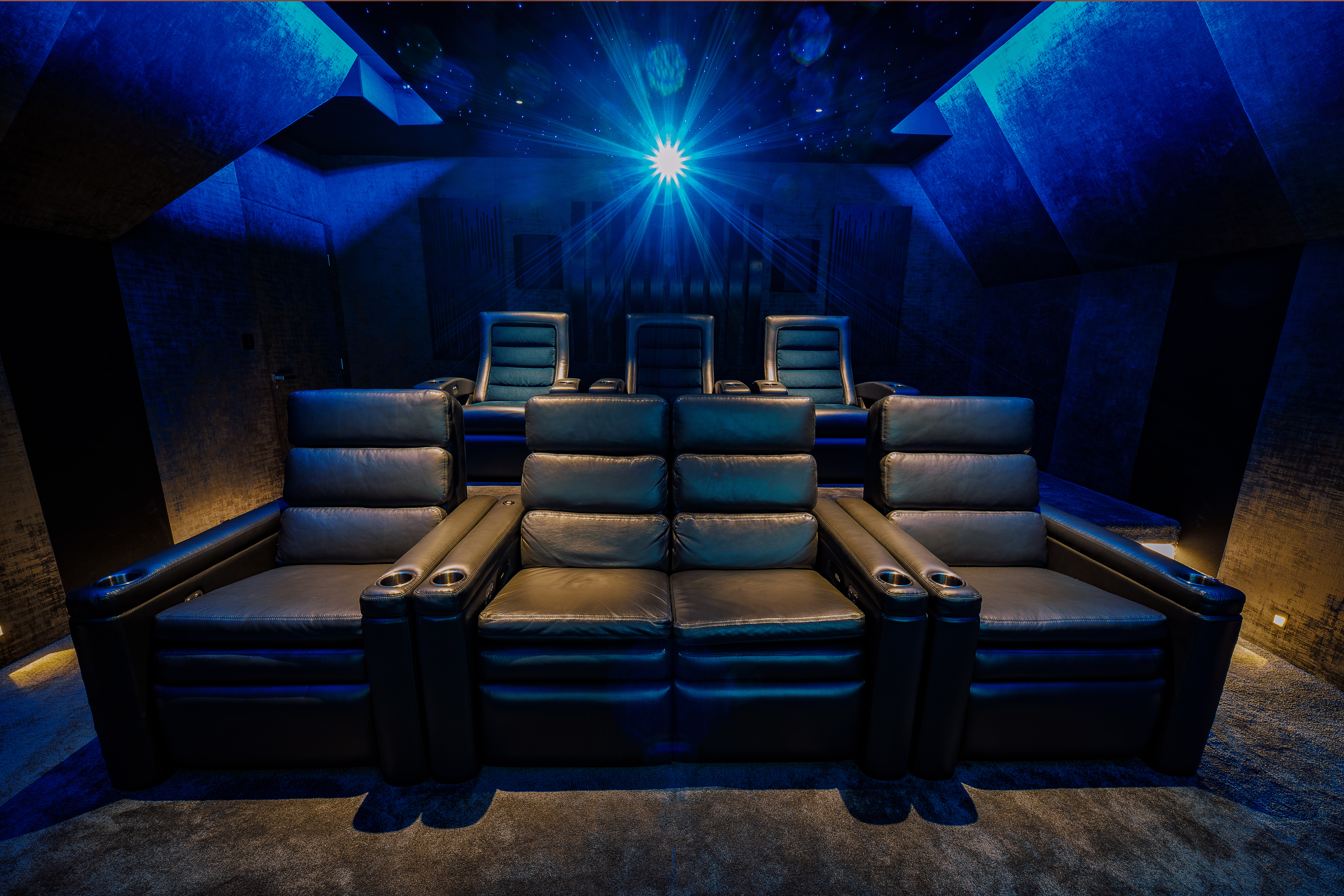 For an added touch of drama, the team included a full star-scape ceiling in the cinema. Naim explains, “I’ve always liked the star ceiling effect and so definitely wanted one for this space. You are able to change the colour, speed, intensity and several other settings. Some love it, some are not as keen, it is a very distinctive look, but we wanted to have the option there. Offering different ways of creating the right cinema for each customer was a really key part of the project.”